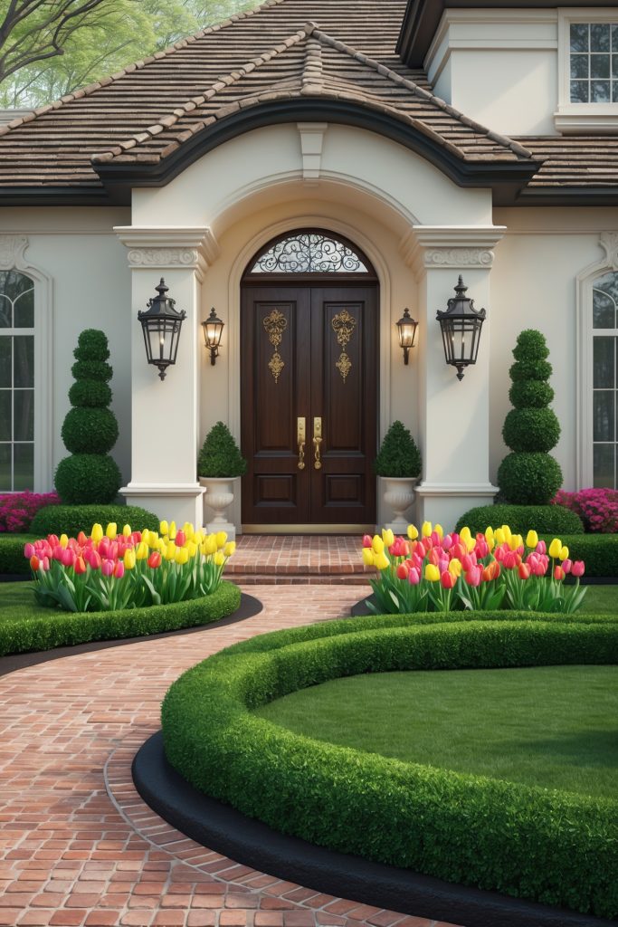 Boost curb appeal with symmetrical flower beds flanking your front door or walkway. This layout emphasizes balance and structure, offering a formal and welcoming entrance to your home.