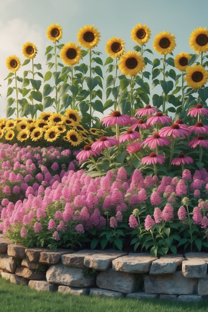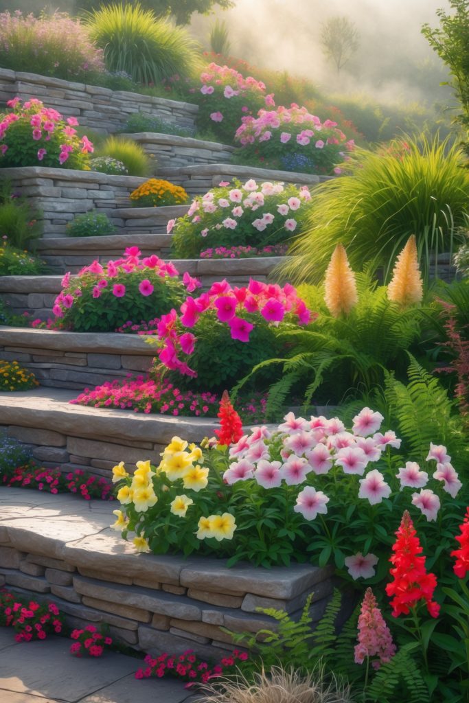 Use cascading plants like creeping phlox or sweet alyssum on the edges to soften the tiers, and anchor each level with bold, upright blooms or ornamental grasses. Not only does this solution add depth and structure to uneven land, but it also gives each flower its time in the spotlight.