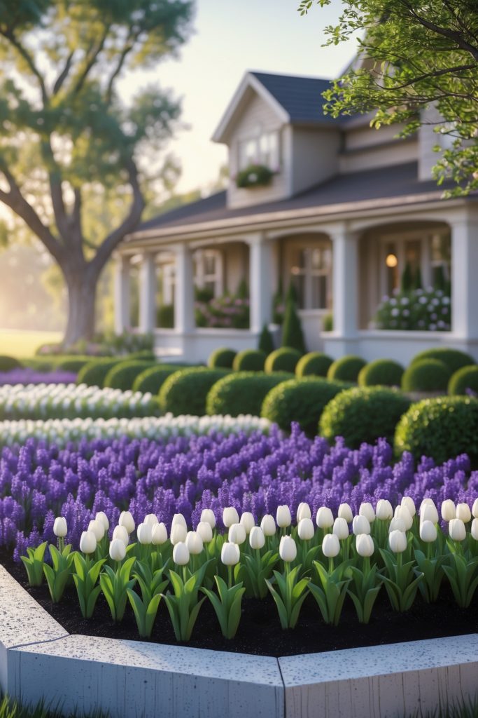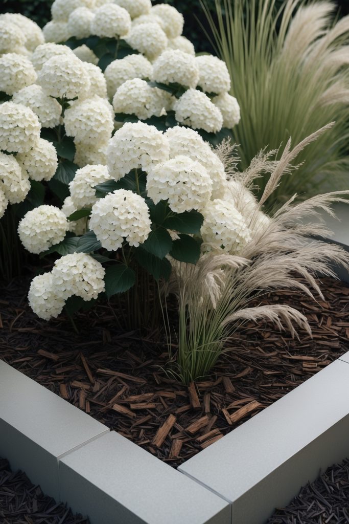 Embrace simplicity and tranquility with a Zen-inspired minimalist flower bed. This design typically features clean lines, a limited color palette, and well-chosen elements such as ornamental grasses, monochrome flowers, and decorative stones or gravel.
