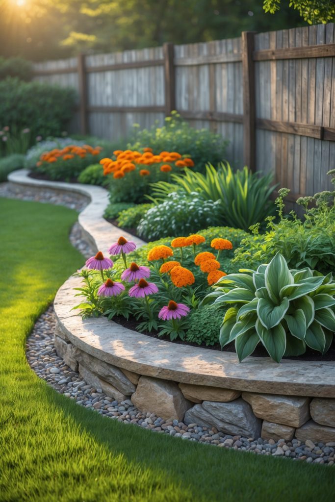 A curved border flower bed is an elegant way to soften the edges of your landscape and bring a sense of movement to your garden. Whether it’s along a walkway, fence, or lawn edge, this flowing shape draws the eye and creates a more organic feel compared to rigid, straight lines. Planting a mix of annuals and perennials in various heights adds depth, while repeating color patterns can help guide the visual flow.