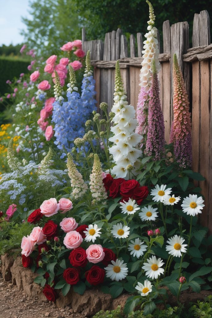 Plant your bed with classic cottage blooms like delphinium, foxglove, hollyhock, and lavender, letting the plants mingle freely and spill over the edges. This type of bed works well along fences, walls, or house foundations, softening hardscapes and encouraging pollinators to visit.