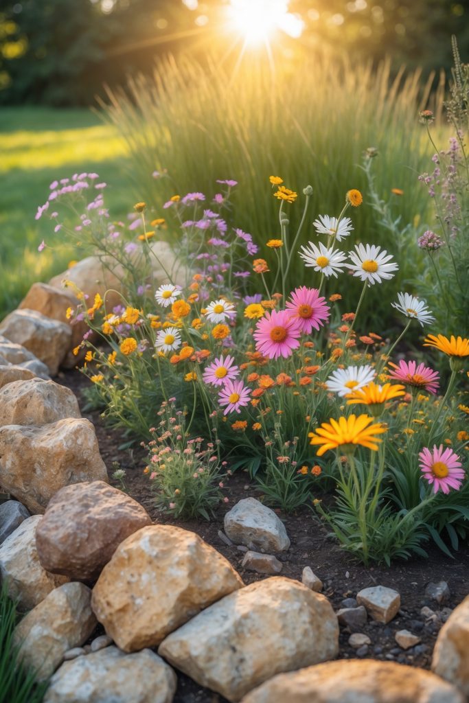 Choose stones of varying sizes and shapes for a natural look, or opt for uniform edging stones for a more structured finish. The rocks pair well with drought-tolerant plants and wildflower mixes, enhancing the overall low-maintenance vibe.