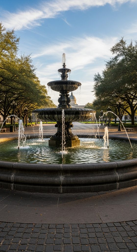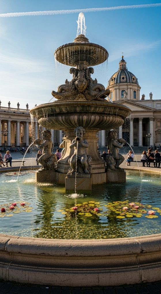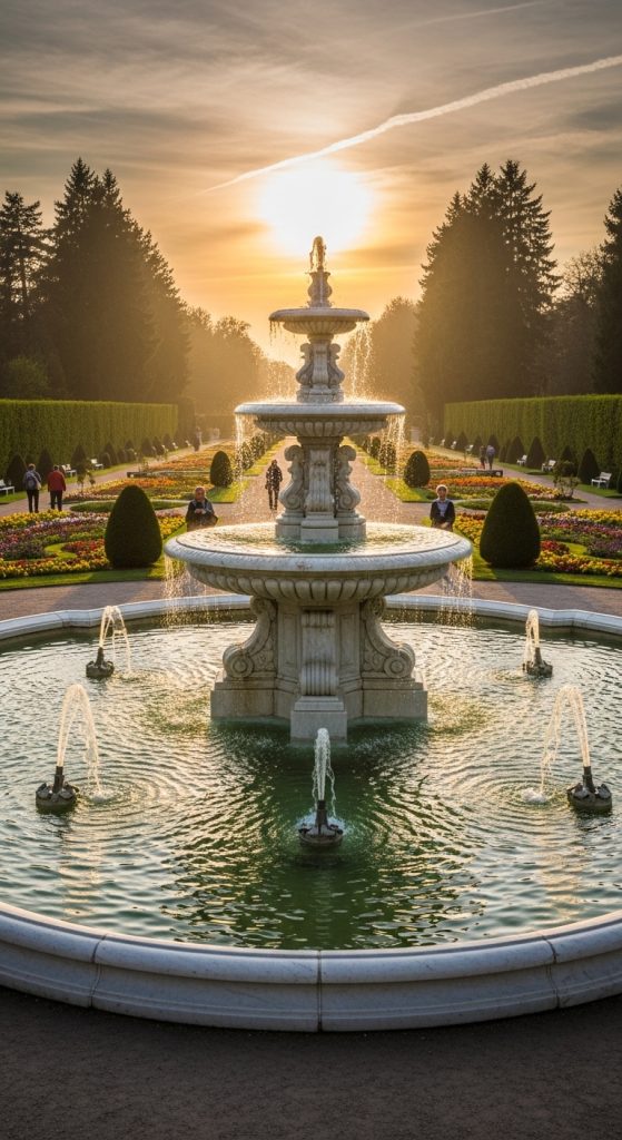 Surrounded by lush greenery and benches, this fountain invites people to sit and enjoy the soothing sound of water. The gentle splashes create a relaxing atmosphere, perfect for unwinding or having a chat with friends.