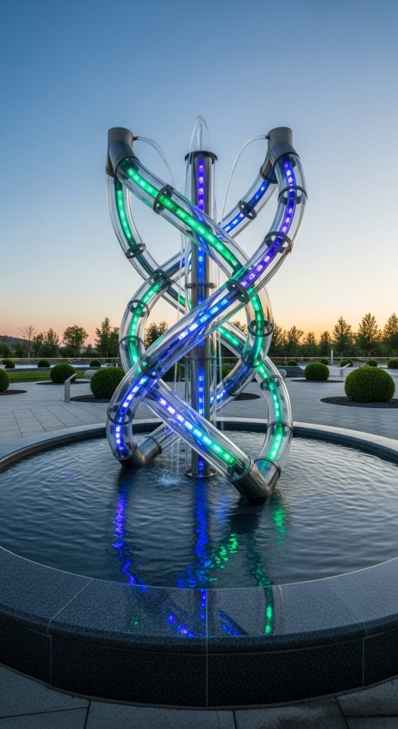 The colorful lights reflect off the water, creating a beautiful scene. Shades of blue, pink, and green swirl together, making it feel like a celebration. This kind of fountain can transform any outdoor space into a lively gathering spot.