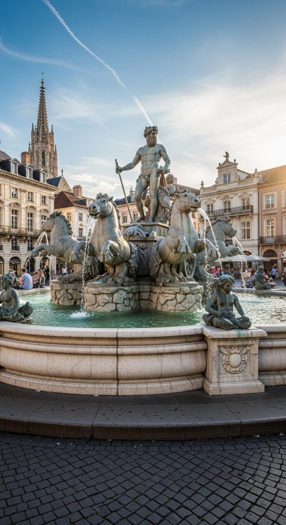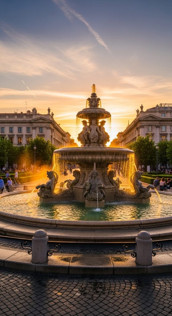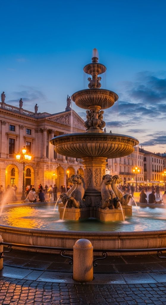 Surrounded by modern buildings, this fountain brings a touch of creativity to the urban landscape. It invites people to pause and appreciate its beauty. Whether you’re taking a stroll or enjoying a moment of relaxation, this fountain offers a refreshing escape.