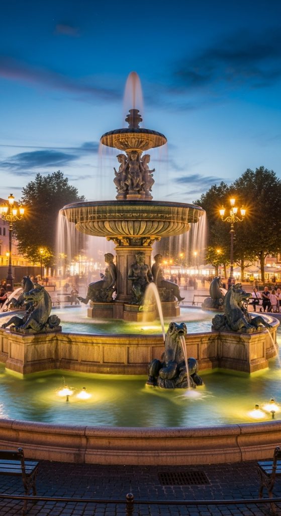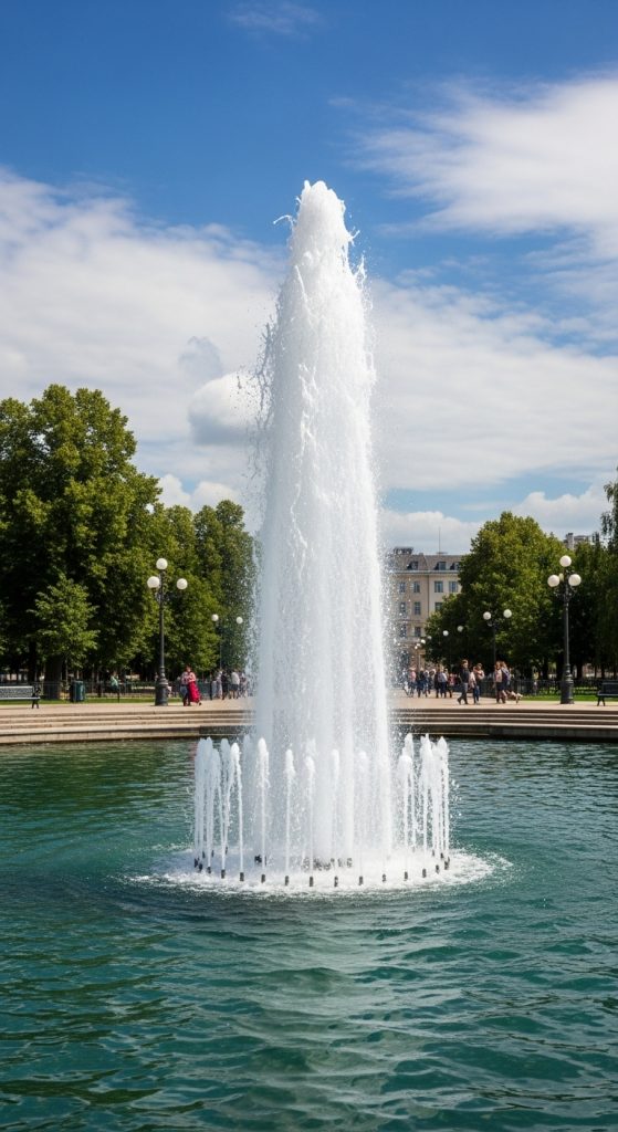 Picture a stunning fountain lighting up the night. This fountain is not just about water; it’s a vibrant display of colors that dance and play. The water shoots high into the air, creating a magical effect that draws everyone in.
