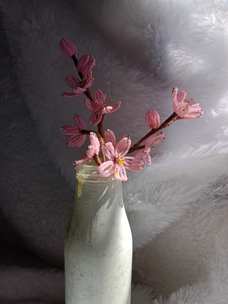 Cherry blossom beadwork has such a delicate and airy feeling to it. Tiny pink petals clustered together create the dreamiest handmade branches.