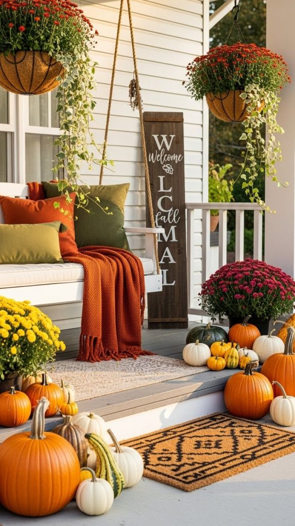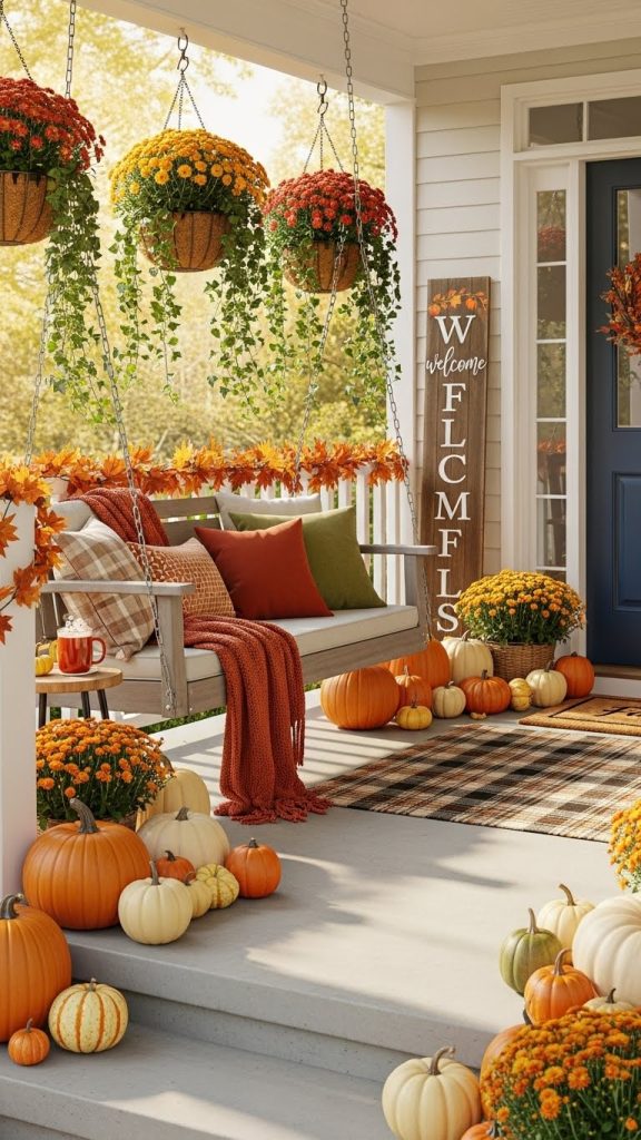 Decorating your front porch for the season can bring a warm and inviting feel to your home. The image shows a lovely porch adorned with autumn accents that perfectly capture the spirit of fall.