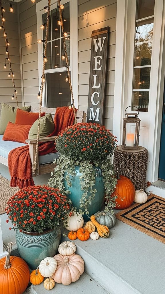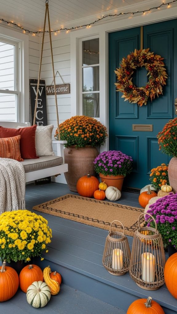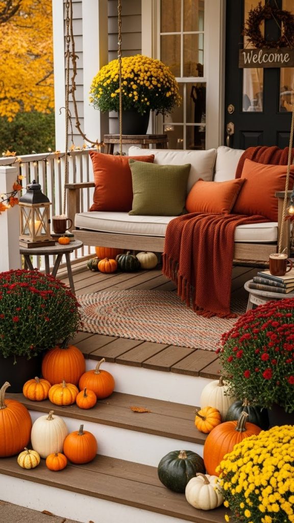 Scattered around the steps are cheerful pumpkins in various sizes. These bright orange decorations are classic symbols of fall and instantly create a festive atmosphere. A few decorative pots with mums enhance the look, bringing in more color and texture.