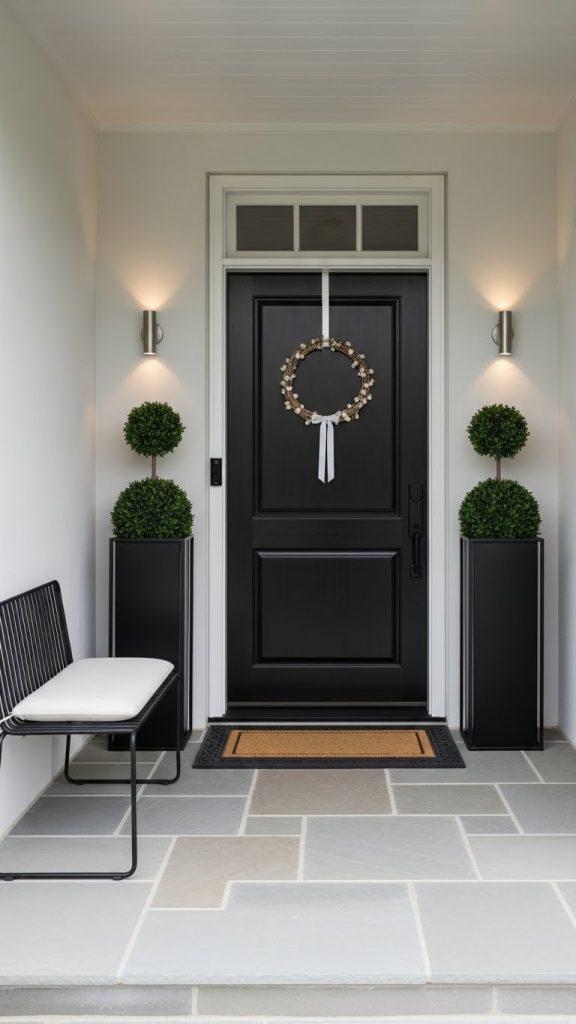 Wreaths on the wall add a seasonal flair, making the entrance feel festive. This combination of functional storage and decorative elements creates a perfect balance, ensuring your porch is both useful and inviting.