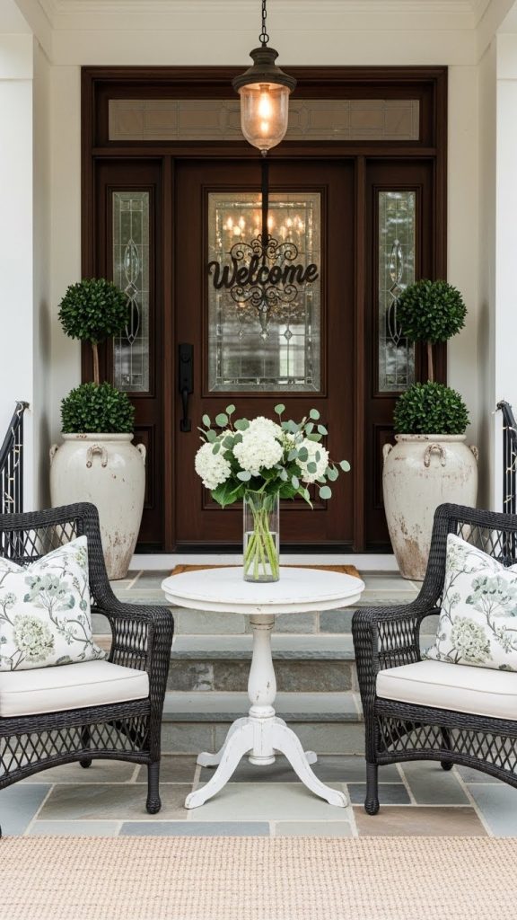 Your front porch can be a delightful spot for relaxation. Imagine stepping outside to a cozy seating area that invites you to unwind. The image showcases a charming setup with comfortable chairs and a small table, perfect for enjoying a morning coffee or evening chat.