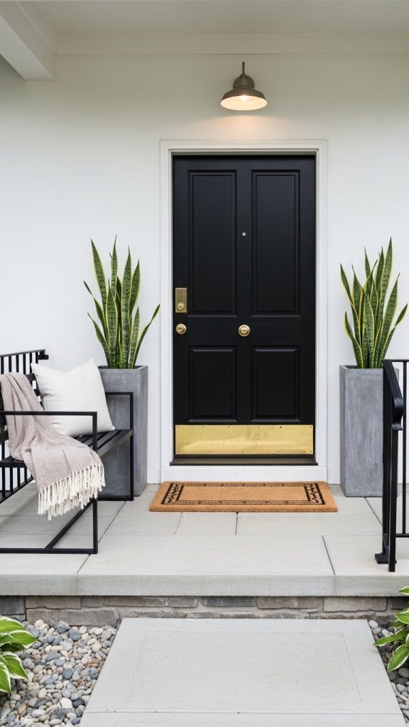 Decorating the bench with a cute pillow adds comfort and personality. The pillow in the image invites guests to sit and relax, making the porch feel welcoming. Surrounding the bench with vibrant potted plants brings life and color, enhancing the overall look.