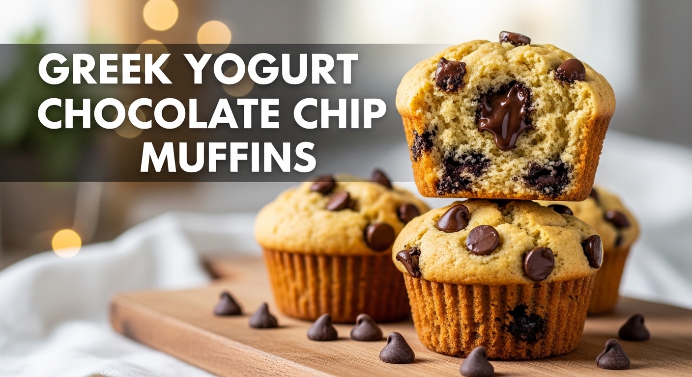 Imagine pulling a batch of golden-brown muffins from the oven, their tops glistening with melted chocolate chips. The rustic kitchen setting, complete with a bowl of Greek yogurt and scattered chocolate chips, adds to the inviting atmosphere.