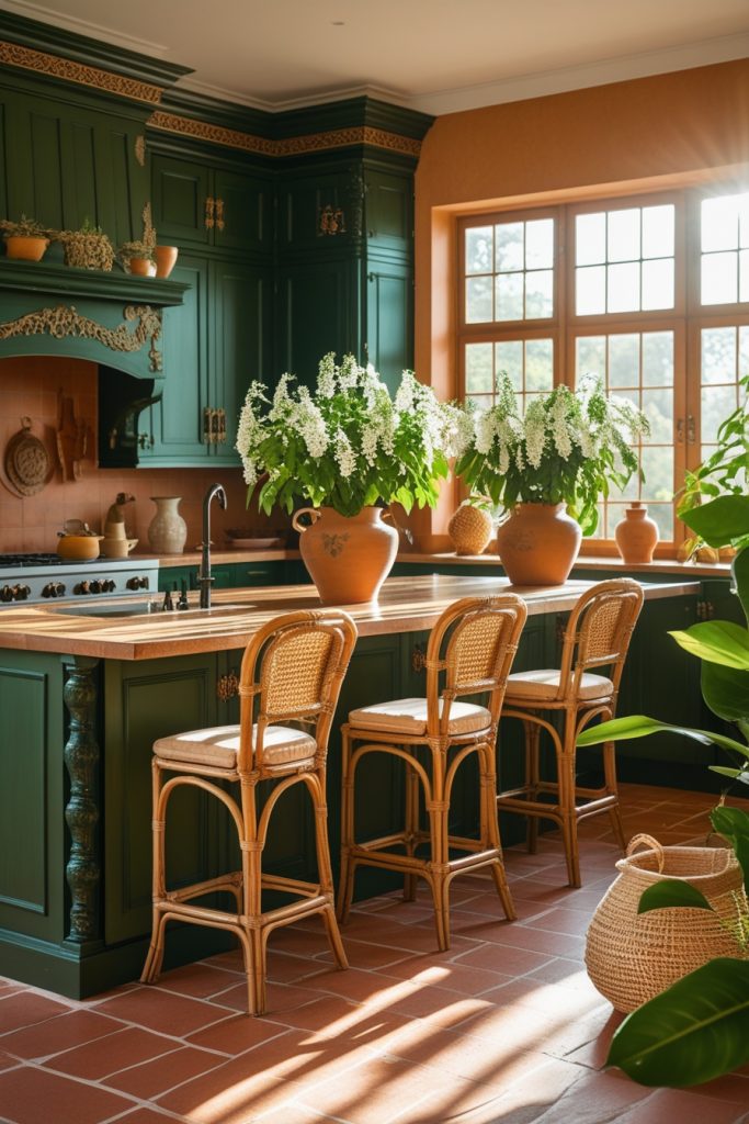 To create an earthy kitchen, incorporate natural green hues that mimic the outdoors. Combine green cabinetry with terracotta tiles, rattan chairs, and potted plants for a harmonious space.