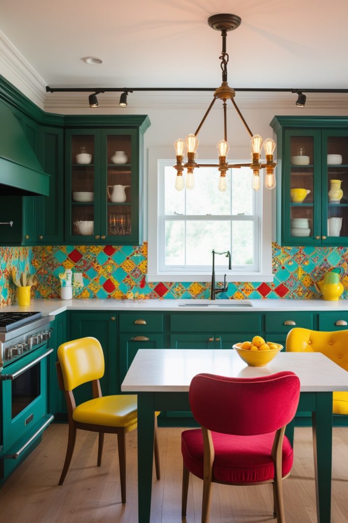 To enhance the eclectic feel, consider mixing materials and finishes. Combine glossy green tiles with matte black hardware, or pair vintage green appliances with modern lighting fixtures. This blend of old and new adds depth and character to the kitchen, making it a true reflection of your unique taste.