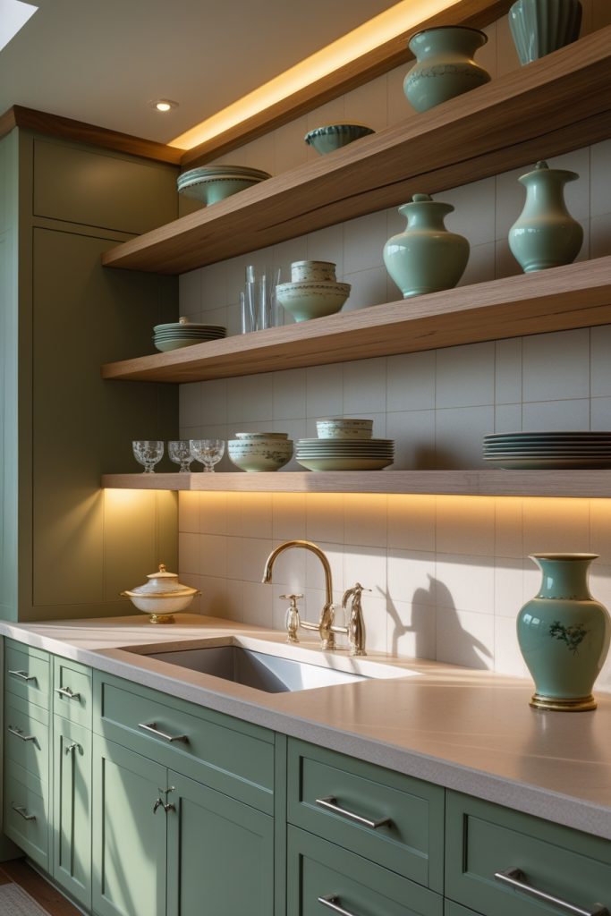 Open shelving allows you to showcase dishware while maintaining an airy feel. Choose green cabinetry and contrast it with natural wood shelves.