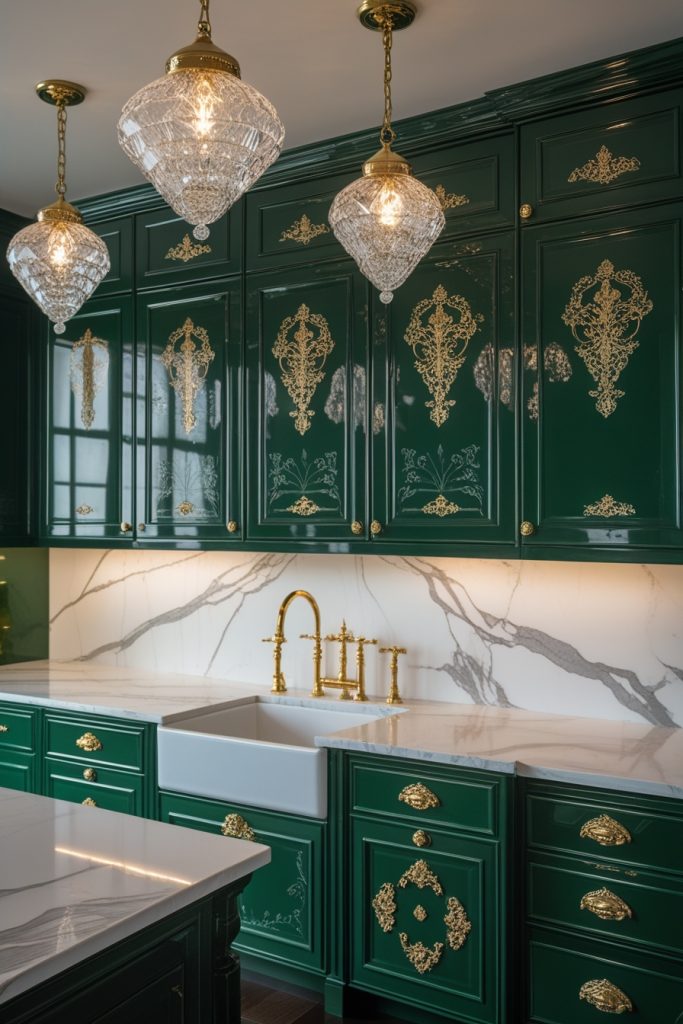 For an opulent look, pair deep green cabinetry with gold accents. Gold hardware, pendant lighting, and marble countertops elevate the sophistication.