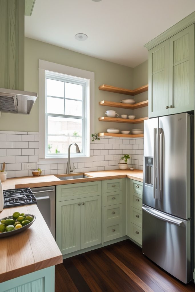 Light green cabinetry pairs seamlessly with classic white subway tiles, offering a crisp and timeless backdrop that highlights the green’s subtle vibrancy. Open or floating wooden shelves enhance the airy feel while adding visual texture and warmth. Choose pale or whitewashed woods to keep the look cohesive and bright, or go for a natural oak to ground the space slightly while keeping the atmosphere serene.