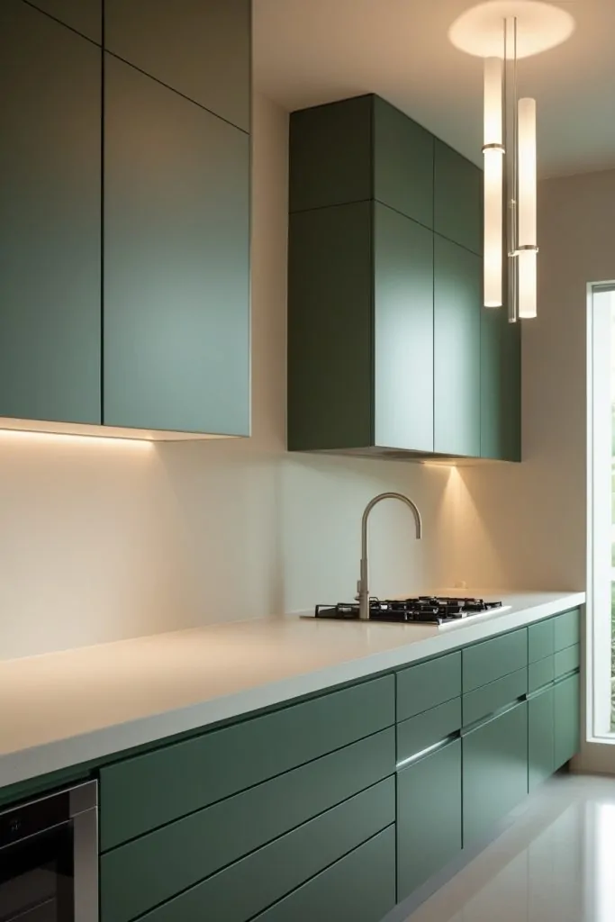 For a sleek and modern aesthetic, use deep green cabinetry with minimal hardware and streamlined surfaces. Matte finishes and integrated appliances complete the contemporary look.