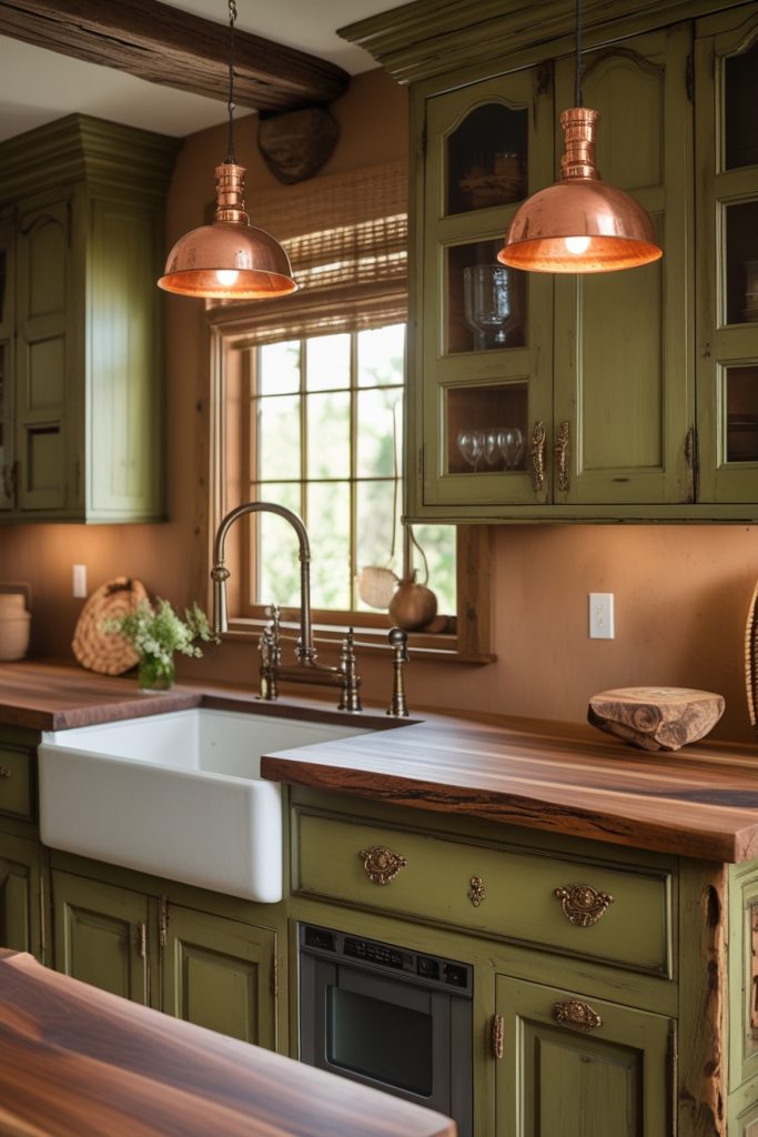 Olive green kitchens exude warmth and elegance, making them a great choice for rustic and farmhouse-style homes. Pair olive green cabinetry with copper accents and a farmhouse sink for a cohesive look.
