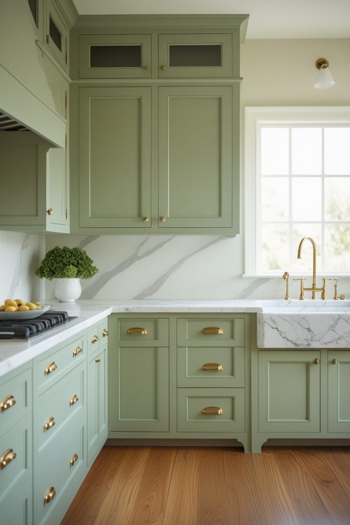Pairing sage green kitchen cabinets with white marble countertops adds brightness and a polished finish, while natural wood accents—like oak shelving or butcher block counters—enhance the organic vibe. This combination creates a warm and cohesive aesthetic that feels timeless rather than trendy. The muted tones also complement brass or matte black hardware, which can shift the style toward farmhouse chic or industrial modern depending on your preferences.