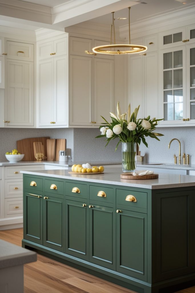 A two-tone kitchen is a stylish way to introduce green without overwhelming the space. Pair a bold green island with neutral upper cabinetry for balance.