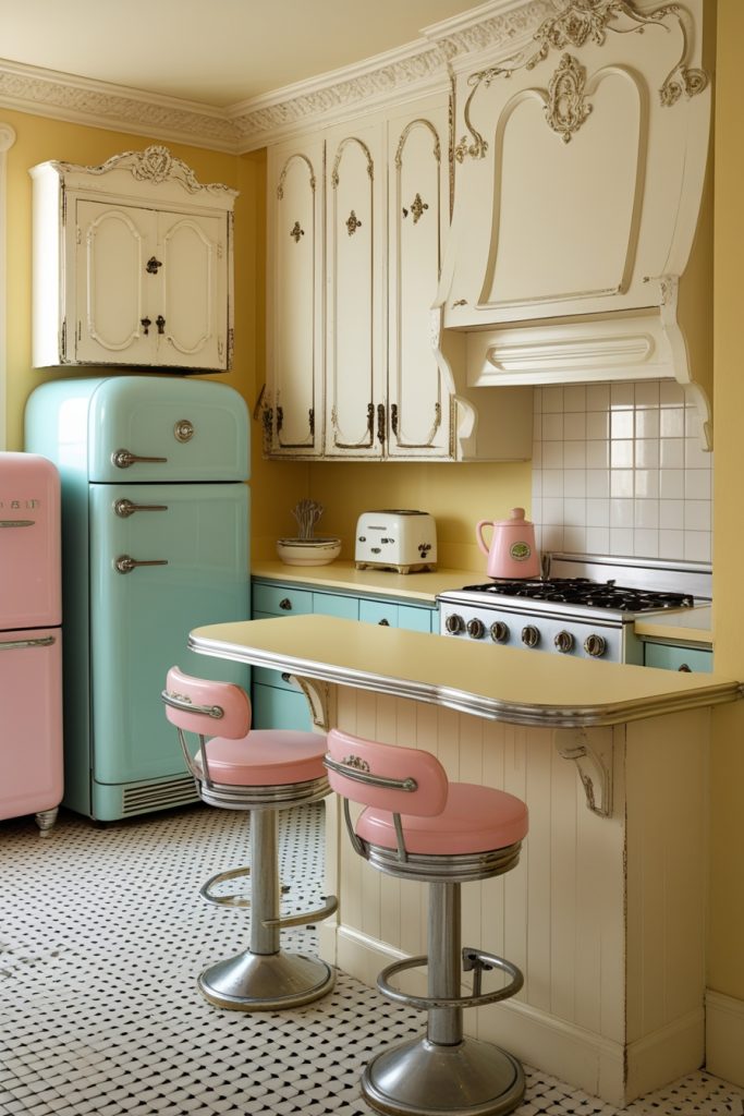 Incorporating classic details—like beadboard paneling, glass-front cabinet doors, and checkerboard floors—adds authenticity and texture to the kitchen. Appliances in retro hues or rounded silhouettes can serve as stunning centerpieces. Pairing green with warm tones such as brass, aged copper, or natural wood helps soften the overall design and enhance its inviting feel.