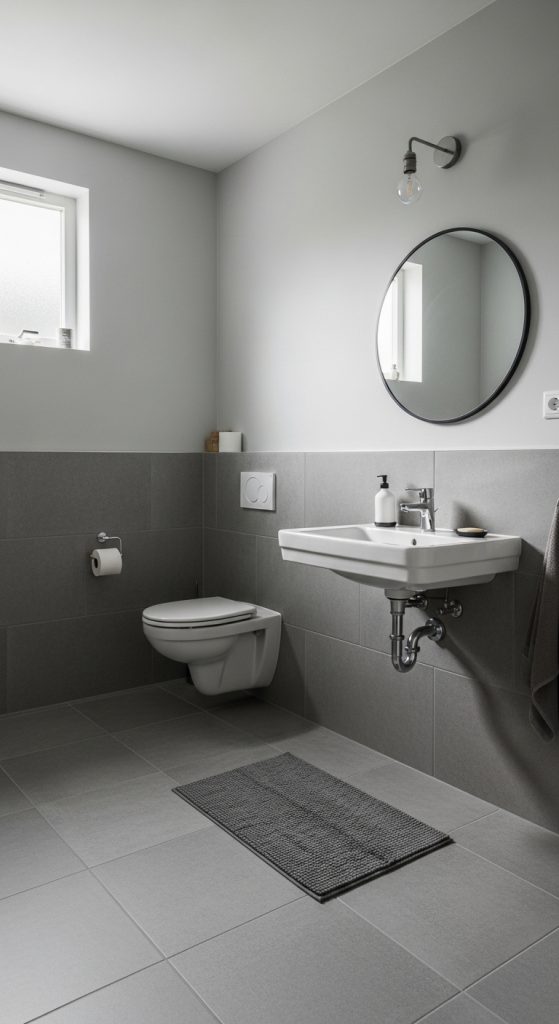 Accent walls in darker grey can anchor freestanding tubs or vanities, but restraint is key. One feature wall is usually enough to create focus without overwhelming the room.