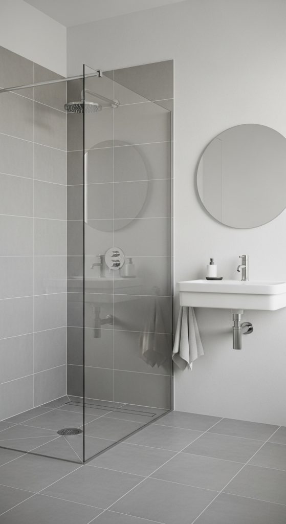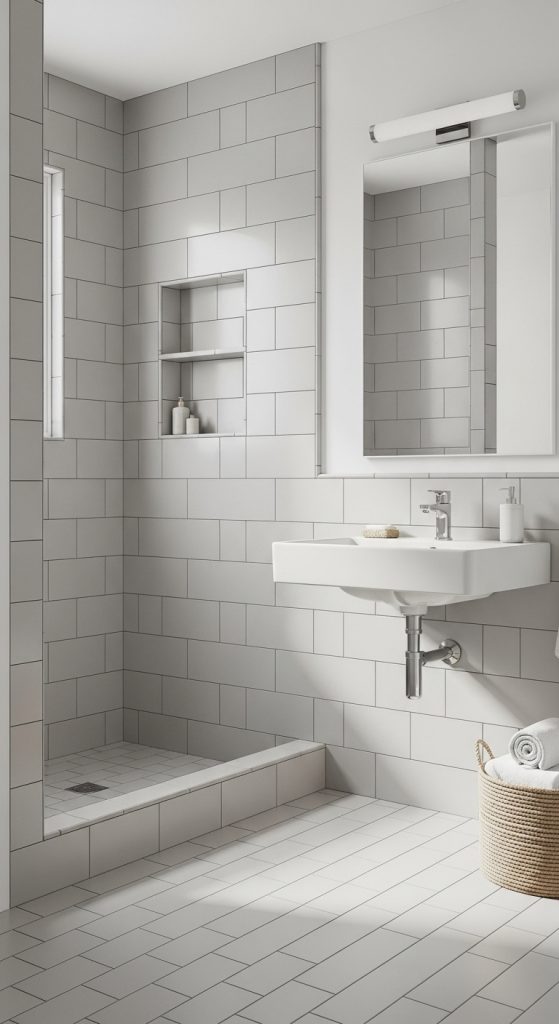 Tile layout directly affects how large or small a bathroom feels. Large-format grey tiles reduce grout lines, creating a cleaner visual field that makes compact bathrooms feel more expansive. They also simplify cleaning and maintenance.