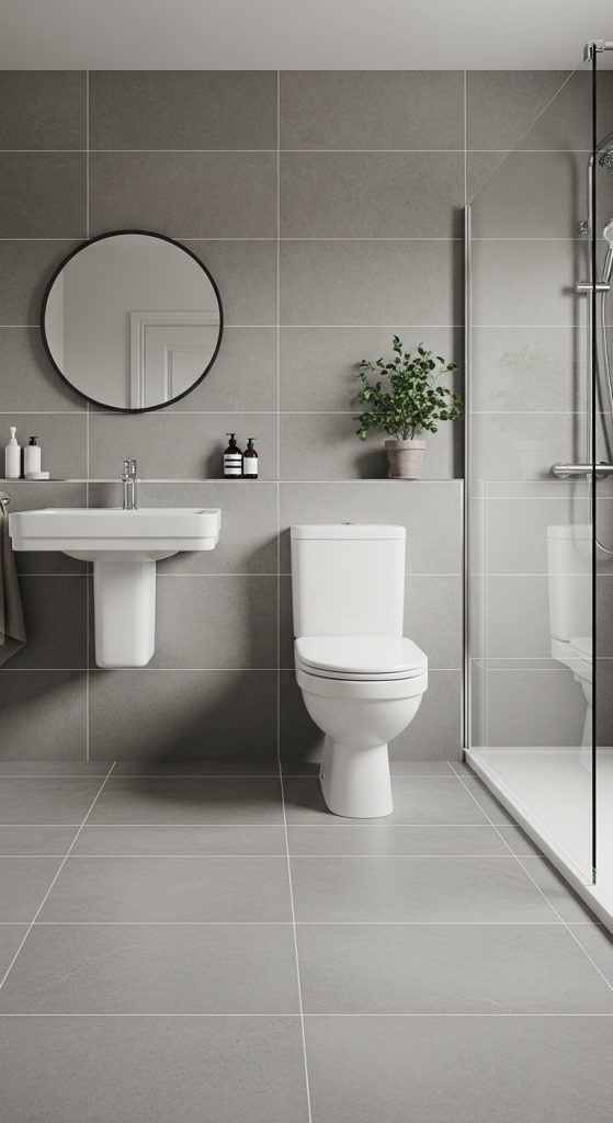 Using the same grey tile on both floors and walls creates a seamless, spa-like effect, especially in smaller bathrooms. This approach works best with subtle textures to avoid monotony.