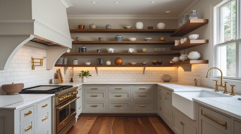Use open shelving sparingly. A single wall with open wood shelves can add warmth and personality, but too much open space can quickly lead to clutter. Display curated items like ceramic bowls, wood cutting boards, or vintage glassware for a lived-in yet edited feel.