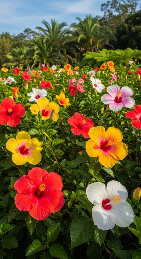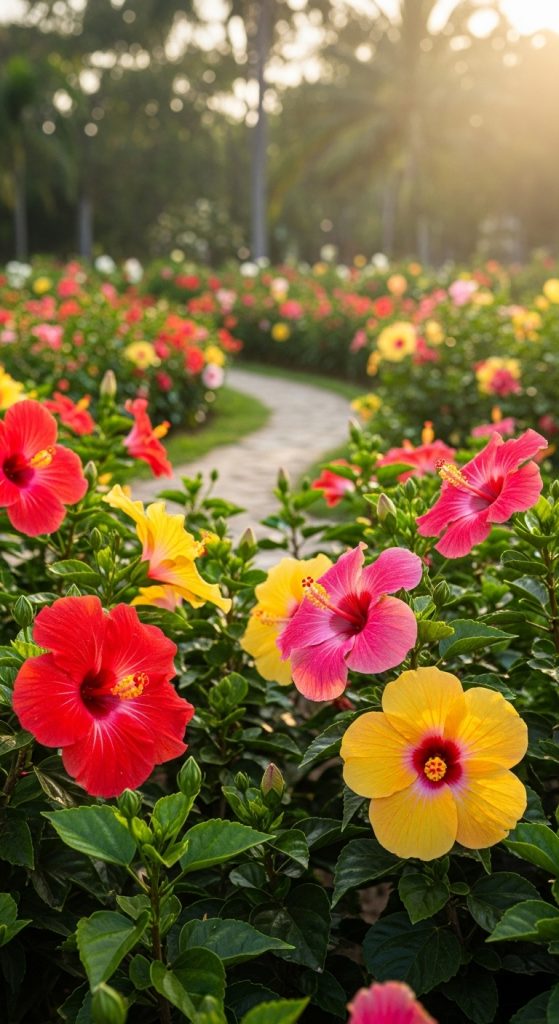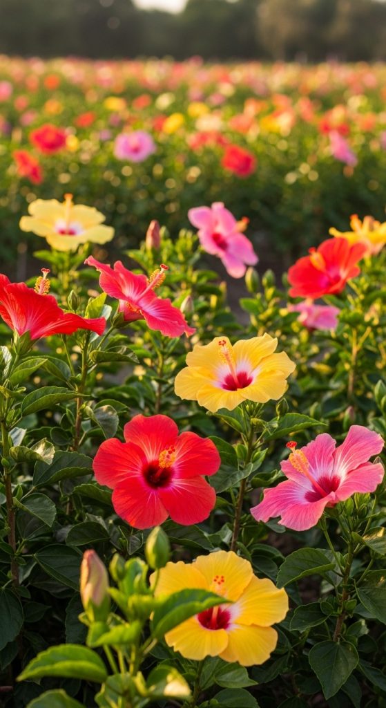 In the image, you can see a lush hibiscus garden filled with bright red flowers. The sunlight plays a big role in their health and vibrancy. When hibiscus plants get enough light, they not only bloom beautifully but also develop a robust structure. If they don’t receive enough sun, they may become leggy and produce fewer flowers.