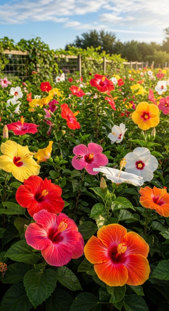 In a hibiscus flower garden, vibrant blooms are the main attraction. To keep these flowers looking their best, proper fertilization is key. The image shows a gardener tending to these beautiful hibiscus plants, surrounded by their striking colors. It’s a reminder of how much care goes into maintaining such a lovely space.