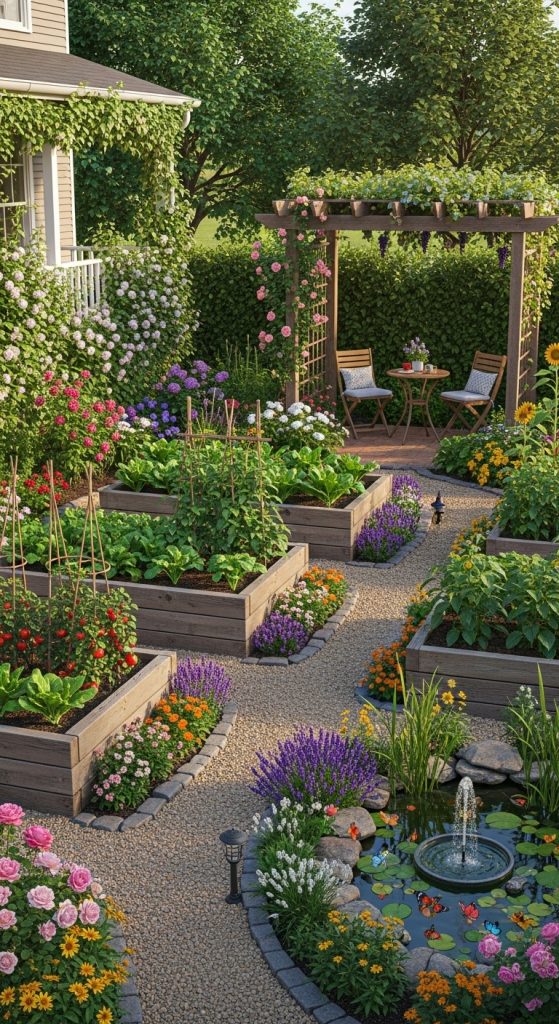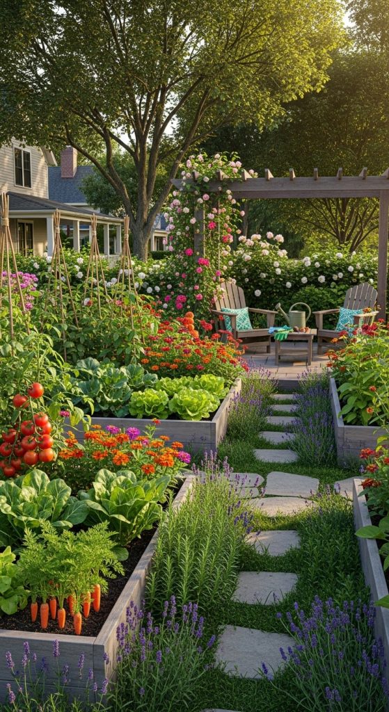Raised garden beds are a fantastic way to grow your own vegetables and herbs. They offer better drainage and soil quality, making it easier for plants to thrive. In the image, you can see several wooden raised beds filled with lush green plants, showcasing how inviting and productive a home garden can be.