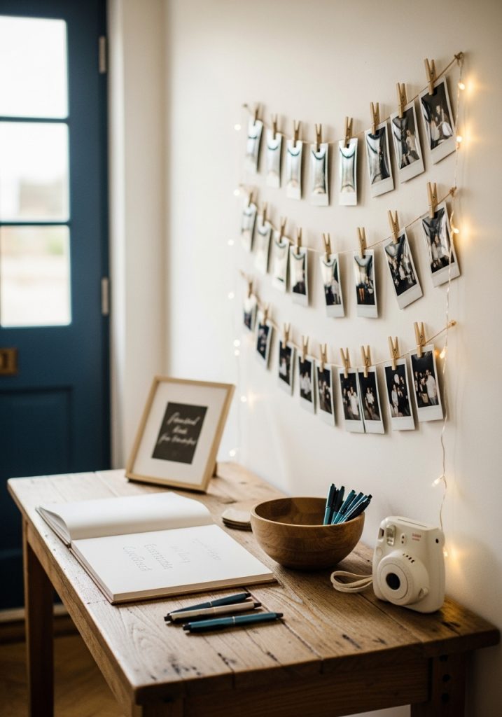 Capture memories by asking guests to leave a note or photo. A simple guest book, a wooden keepsake board, or a string with hanging Polaroid pictures can double as both decor and memorabilia.