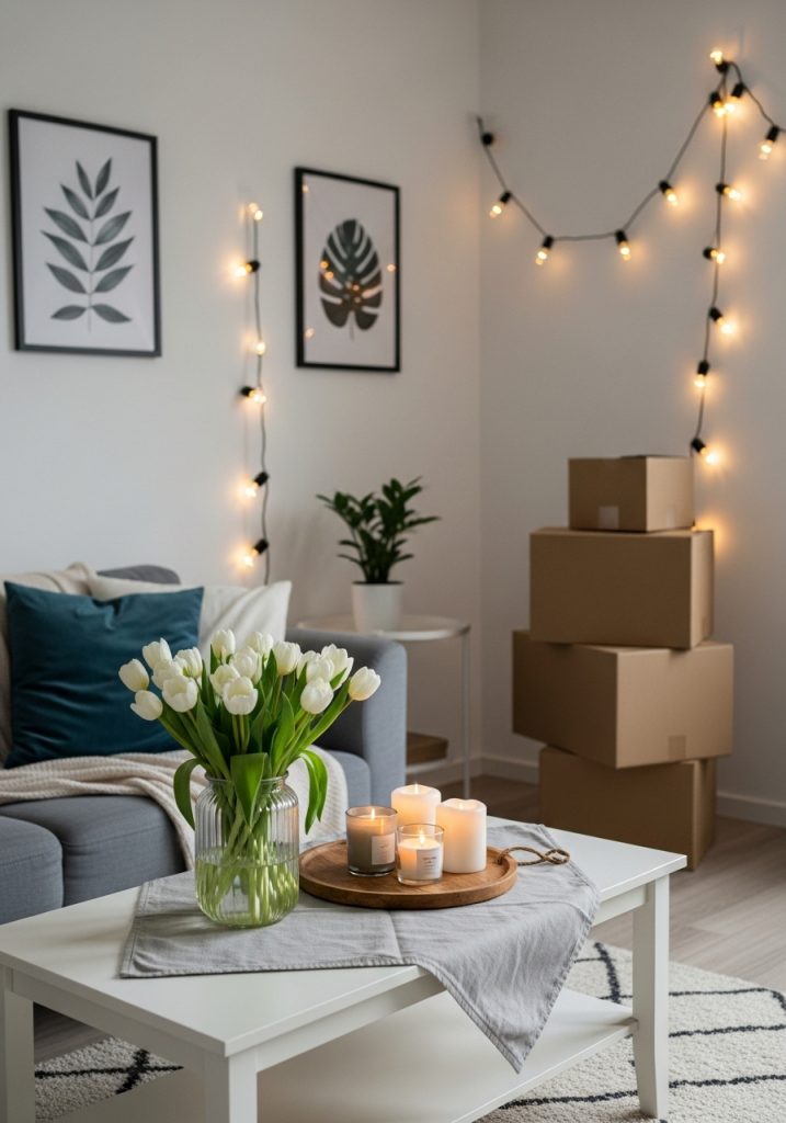 If you’re still settling in and boxes are around, no problem! Incorporate unpacked items into the decor (e.g., stacked books as a centerpiece or crates as trays).