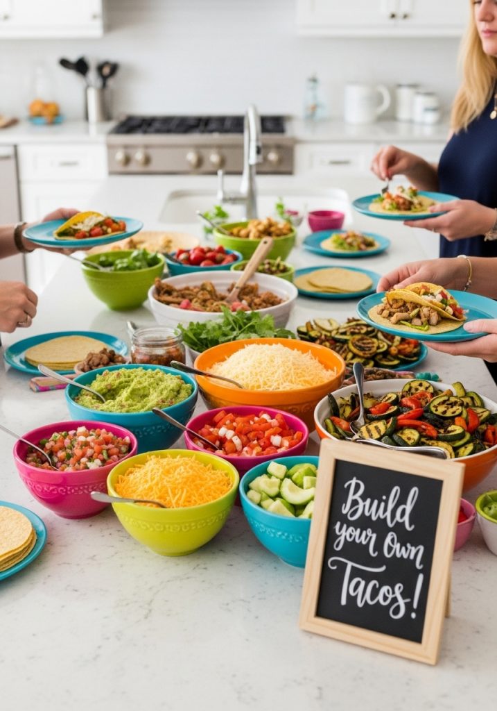 Interactive food stations are a hit at housewarming parties. Not only do they encourage mingling, but they also let guests customize their food just how they like it. Popular setups include: