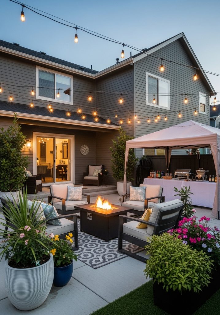 If you have a yard, patio, or balcony, incorporate it into the party. Set up cozy seating areas with outdoor rugs, lanterns, and string lights. Use the grill, firepit, or even a projector screen to make the event feel open and festive.