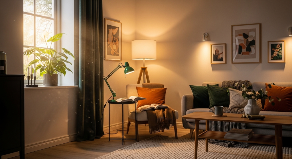 Lighting dramatically affects how spacious a room feels. Dark corners shrink a room, while layered lighting creates depth and warmth.