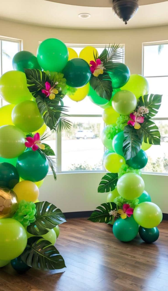 A giant balloon setup with shades of green, gold, and animal-print balloons instantly makes the whole party feel magical. Adding oversized palm leaves between the balloons gives everything that wild jungle look that feels so fun in photos.