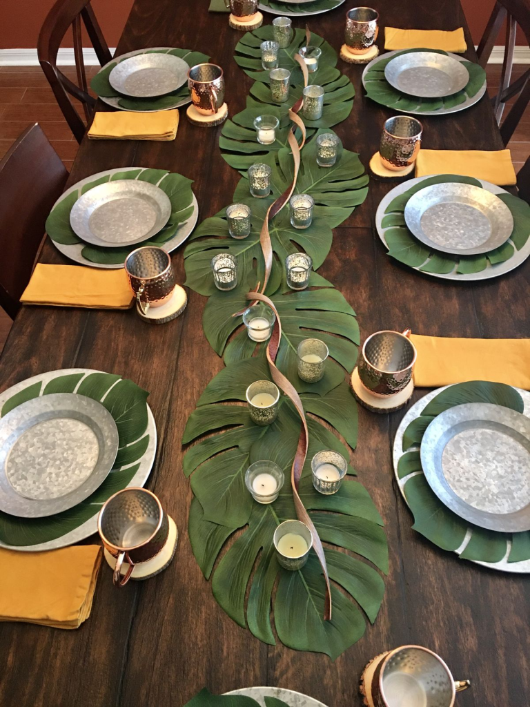 A jungle-themed table setup feels so beautiful with leafy runners, gold plates, and animal-print napkins layered together. The mix of textures makes the table feel rich and adventurous without needing too many decorations.