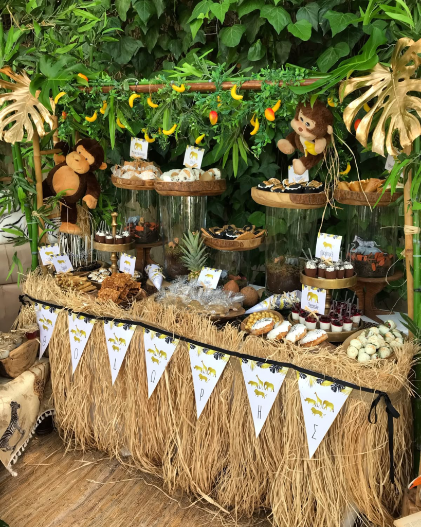 You can also add bamboo-style stands or woven baskets to make the table feel more natural and earthy. Even simple snacks look adorable when styled with jungle decorations around them.