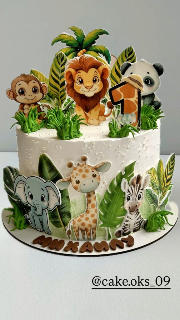 A jungle cake always becomes the star of the party when surrounded by tropical leaves and little safari decorations. Cakes with jungle animals, vines, and earthy colors look incredibly adorable in photos.