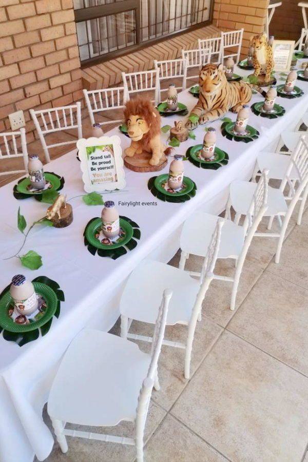 Tiny jungle animals placed between plates or next to cups make the whole setup feel playful and detailed. It’s one of those little touches guests always notice and love.