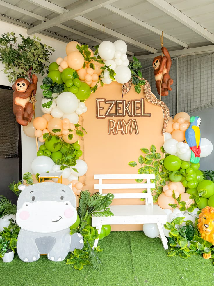 I also love when people add little monkey or tiger balloons hidden inside the arch because it makes the setup feel playful and full of surprises. This is the kind of backdrop that makes guests stop and say “wow” the second they walk in.