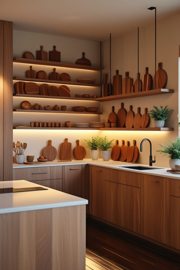 Wooden bowls, cutting boards, and utensil holders add organic texture while remaining functional. You might even bring in wood-framed artwork or a reclaimed beam for a subtle architectural detail. These touches balance out modern appliances and sleek finishes, offering a layered, lived-in look.