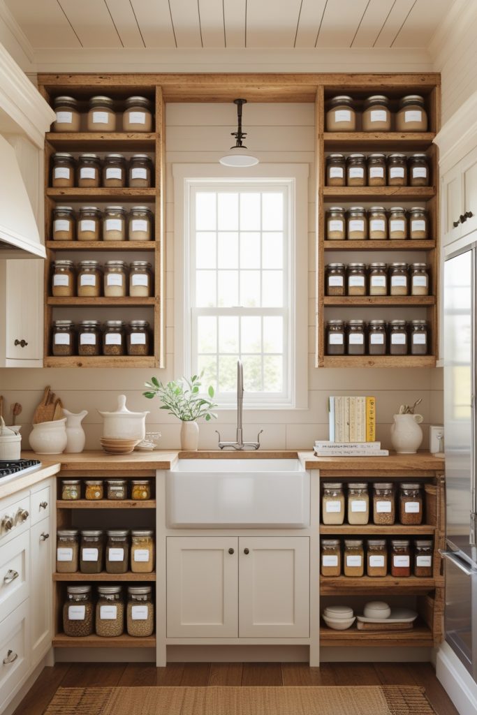 Turning your pantry items into a curated display is both practical and aesthetically pleasing. Think labeled glass jars with bamboo lids, neatly organized shelves, and baskets for bulkier items—all exposed in a way that feels like styled storage.