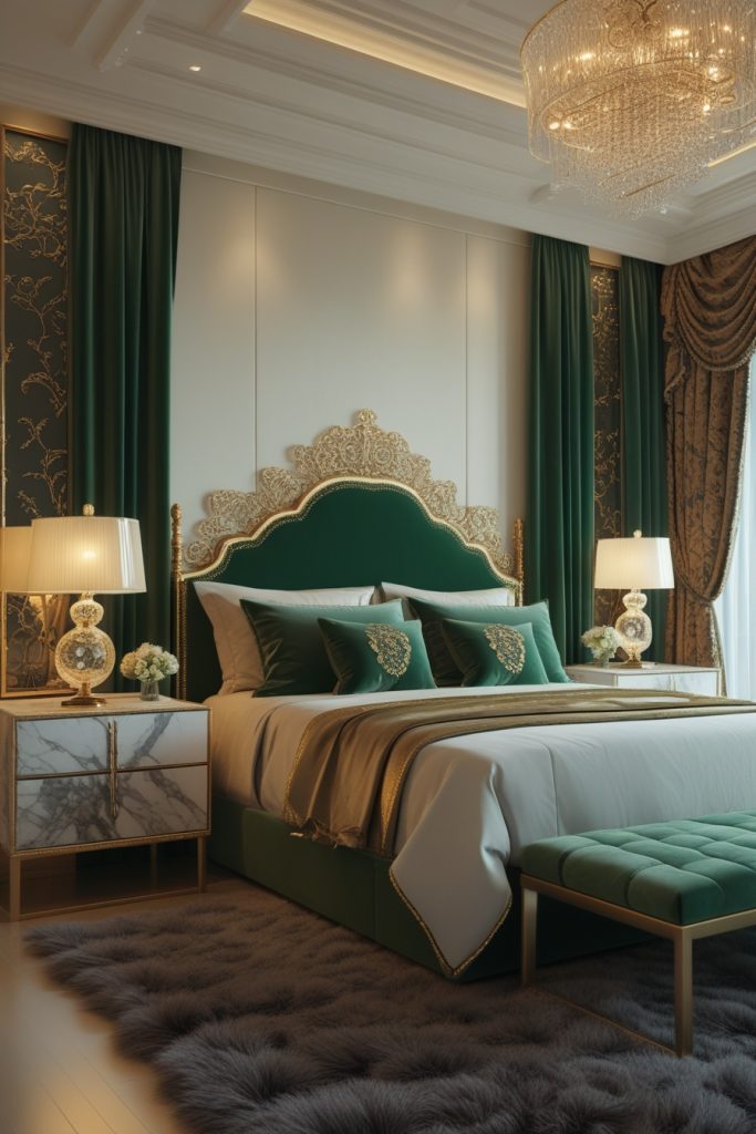 This bedroom feels like checking into a five-star hotel—without leaving home. Every detail is considered, from the padded headboard to the marble-topped nightstands. Gold accents and velvet fabrics bring richness, while soft lighting creates a romantic, mood-lit ambiance.