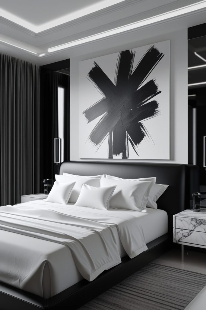 Leather, marble, and matte finishes bring texture into the design, while high-contrast artwork and sculptural furniture pieces inject personality. Symmetry is often employed, with matching lamps or nightstands adding to the sense of order.