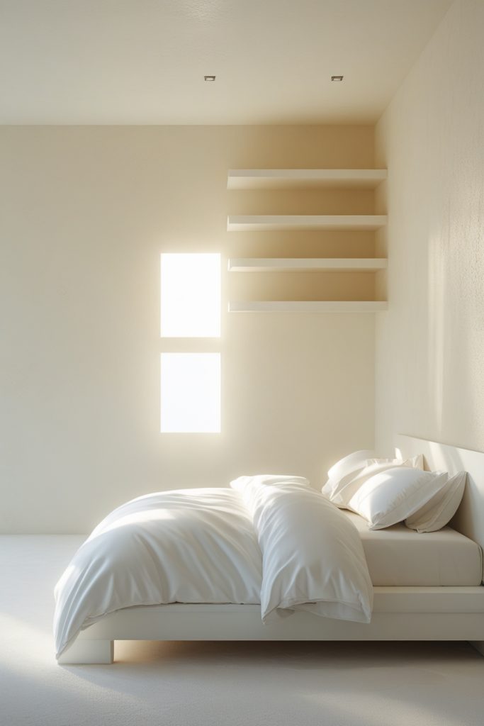 The all-white minimalist bedroom is a bold commitment to simplicity and clarity. Walls, floors, bedding, and furniture blend into a seamless palette of snow, ivory, and frost. The result is a bright, clean canvas that feels fresh and expansive—especially effective in smaller spaces.